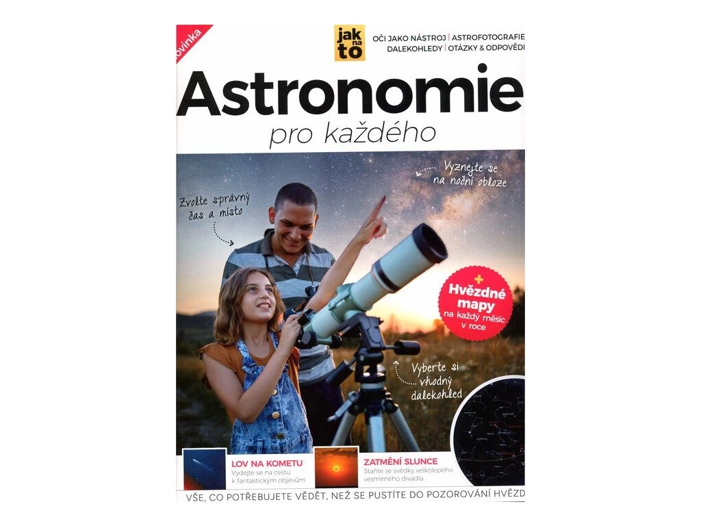 Vše co potřebujete vědět, než se pustíte do pozorování hvězd K pozorování noční oblohy nepotřebujete sbírku akademických titulů, encyklopedické znalosti a vlastně ani drahý dalekohled. Celou řadu pozoruhodných jevů zaznamenáte nevyzbrojeným okem, což přispívá k neodolatelnému půvabu amatérské astronomie. Stačí poznat základní orientační body a naskytne se vám úchvatný pohled na planety, souhvězdí, mlhoviny, meteorické roje a další nevšední vesmírné úkazy. Pokud neodoláte a investujete do astronomického dalekohledu, svět nad vaší hlavou se promění ve velkolepou galerii, plnou barev a scenérií, nad kterými se tají dech. Náš přehledný průvodce vás krok za krokem vybaví veškerými potřebnými informacemi od výběru vhodného vybavení, přes mapy hvězdné oblohy po praktický návod, kdy, kde a především jak sledovat nejkrásnější astronomické úkazy. Otočte stránku a vydejte se na vzrušující cestu za tajemstvím vesmíru!Doplňkové parametry