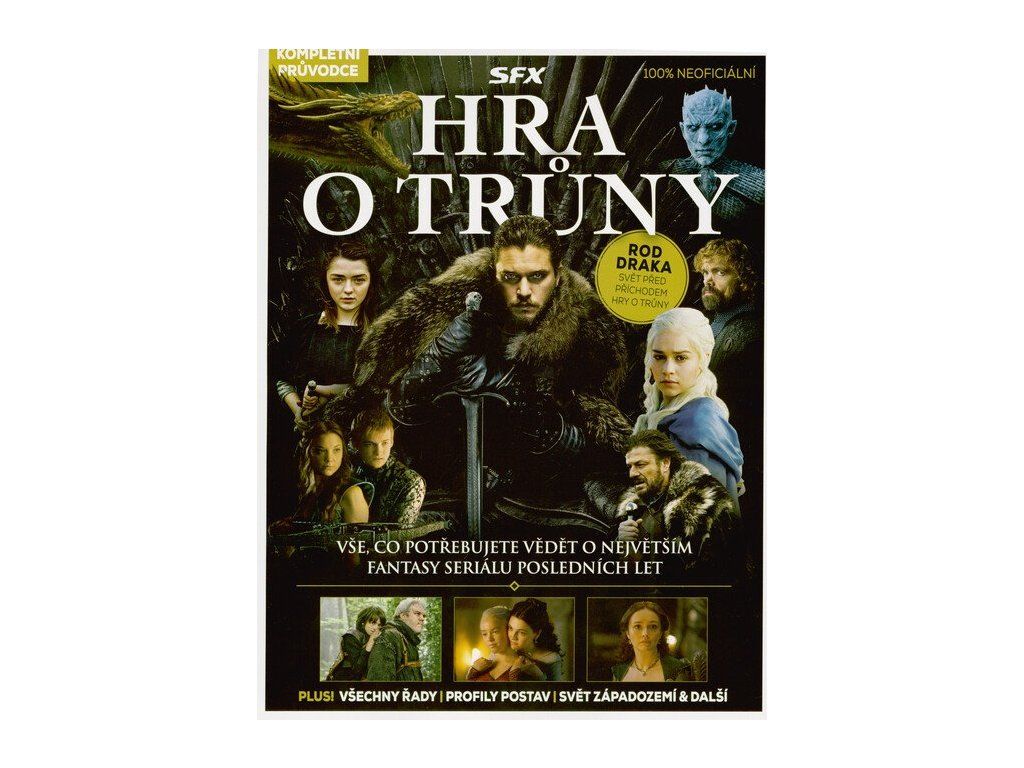 Vše, co potřebujete vědět o největším fantasy seriálu posledních let. Všechny řady Profily postav Svět Západozemí & další. V roce 2011 se před zraky užaslých, ale nadšených televizních diváků začala odvíjet dramatická sága podle knižní série George R. R. Martina Píseň ledu a ohně, nazvaná Hra o trůny. Netrvalo dlouho a seriál, jehož podstatnou část tvořily scény plné brutálního násilí, bezostyšného sexu nebo politických intrik, a došlo i na draky chrlící oheň, se oprávněně stal nejsledovanějším a nejdiskutovanějším televizním dílem planety. Dočkal se osmi řad, které lámaly rekordy ve sledovanosti, a úhrnem nasbíral přes 250 cen. Tento kompletní průvodce Hrou o trůny skládá výjimečné fantasy podívané hold, zároveň se zamýšlí nad vším, co z ní udělalo takovou mimořádnou událost. Prožijte znovu všech 73 epizod, připomeňte si nejušlechtilejší (a také nejděsivější) postavy seriálu, vydejte se na putování po úžasném Západozemí a setkejte se znovu s jeho nejslavnějšími dynastiemi. Pokud stále nebudete mít dost, neváhejte zalistovat až na závěrečné stránky našeho speciálu, kde se dozvíte všechny zásadní informace o příbuzném seriálu s názvem Rod draka (2022), jehož děj předchází událostem Hry o trůny o několik století. Příjemnou zábavu! Natáčení Hry o trůny. Prozkoumejte, jak vznikal největší a nejdiskutovanější seriál světa. Postavy Poznejte osobně ty nejlepší a nejhorší ikonické postavy ze Hry o trůny Průvodce dějem. Připomeňte si osm epických řad seriálu plných šokujících scén, násilí a zrady. Rod draka. Ponořte se do minulosti a zjistěte, co se odehrálo dvě století před Hrou o trůny.Doplňkové parametry