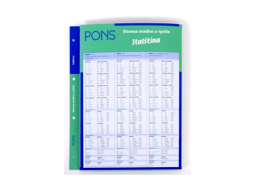 Praktický tahák pro žáky a studenty, do úřadů a institucí, v nichž se hovoří cizími jazyky, pro každého, kdo potřebuje rychle najít informace o slovesech a jejich správném tvoření a užívání. Šestistránková laminovaná a omyvatelná skládačka s jednoduchým a přehledným grafickým řešením, barevně zvýrazněnými výjimkami a příkladovými větami s českými překlady. Tato pomůcka vám poskytne vše o pravidelných i nepravidelných slovesech a jejich vzorech i pravopisných zvláštnostech. Založte si ji do svých oblíbených pořadačů! Spolu s podobnými materiály edice PONS může vytvořit základ vaší jazykové průpravy.Doplňkové parametry