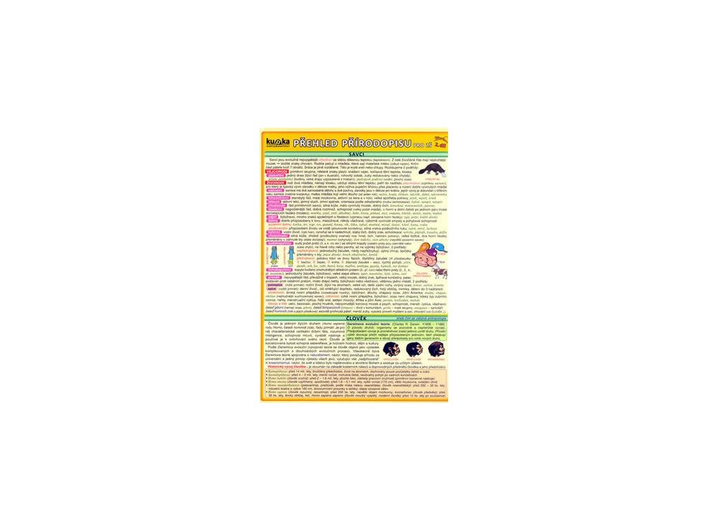 Přehledně zpracovaná učební látka 8. a 9. ročníku ZŠ zahrnující anatomii člověka, genetiku i geologii. Přehled mimo jiné obsahuje 31 grafických ilustrací, 4 tabulky, přehledné členění krystalových soustav, stupnice tvrdosti.Doplňkové parametry